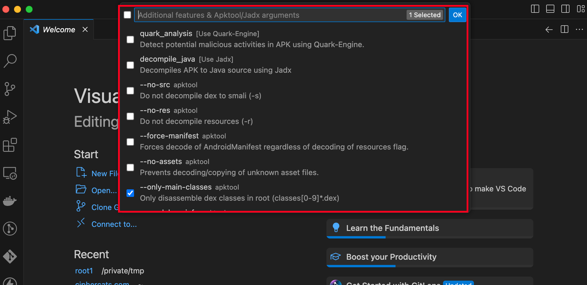 Open VSCode and press “Ctrl + Shift + p” then search for “APKLab”. Click on “Open an apk”
