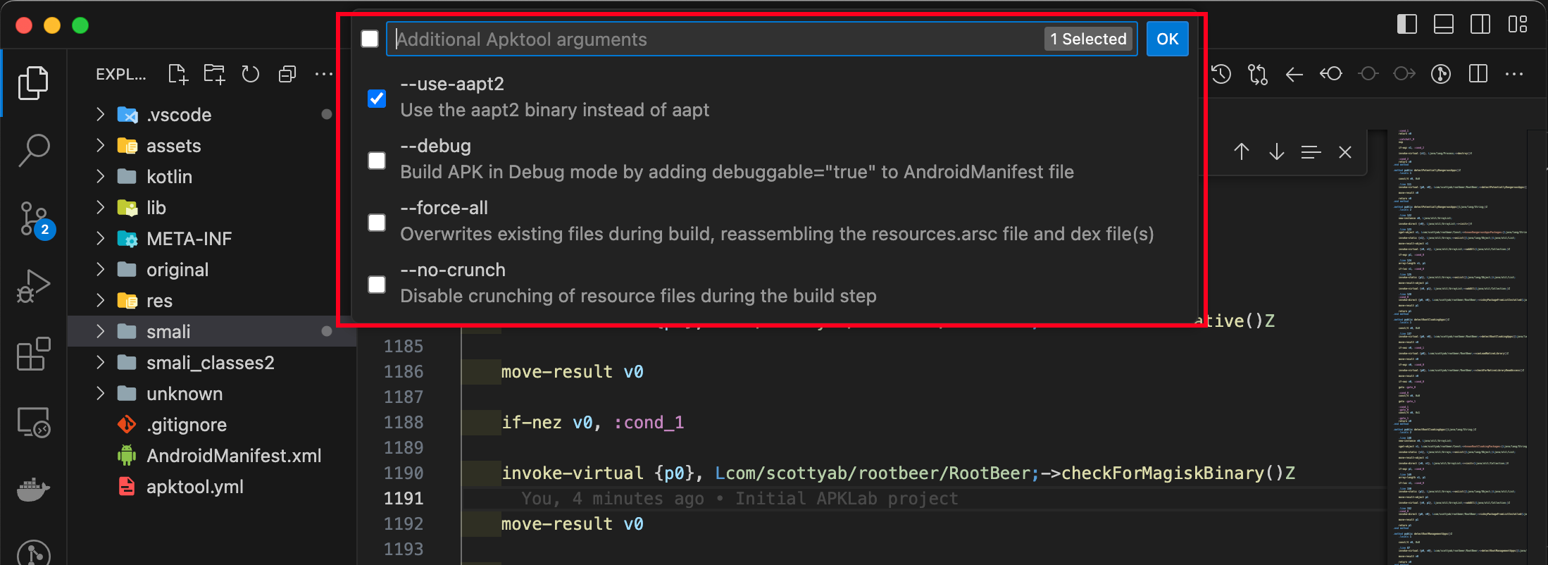 Right click on “apktool.yml”. Select an option you fit. The APKLab will rebuild and sign the application for you