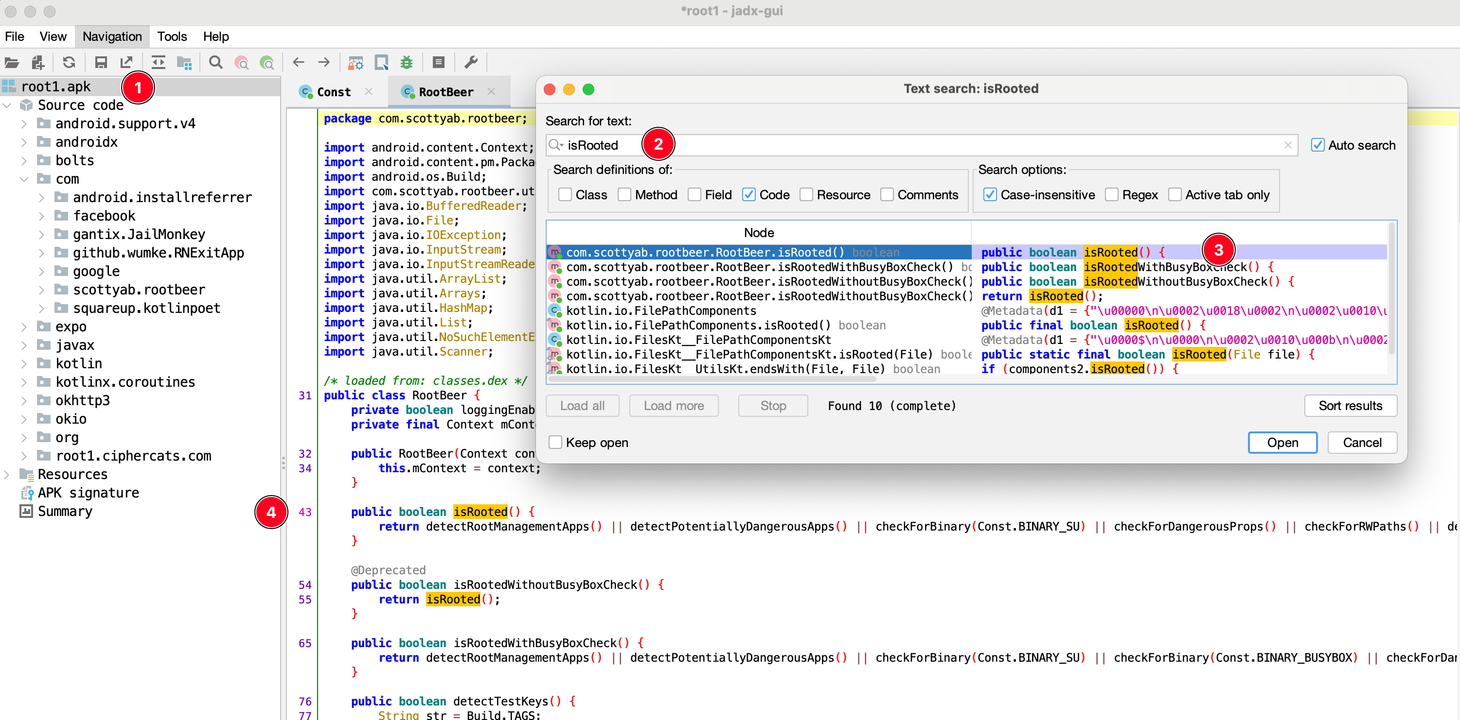 2. Search for keywords such as isRoot, “su”, “su” and etc.